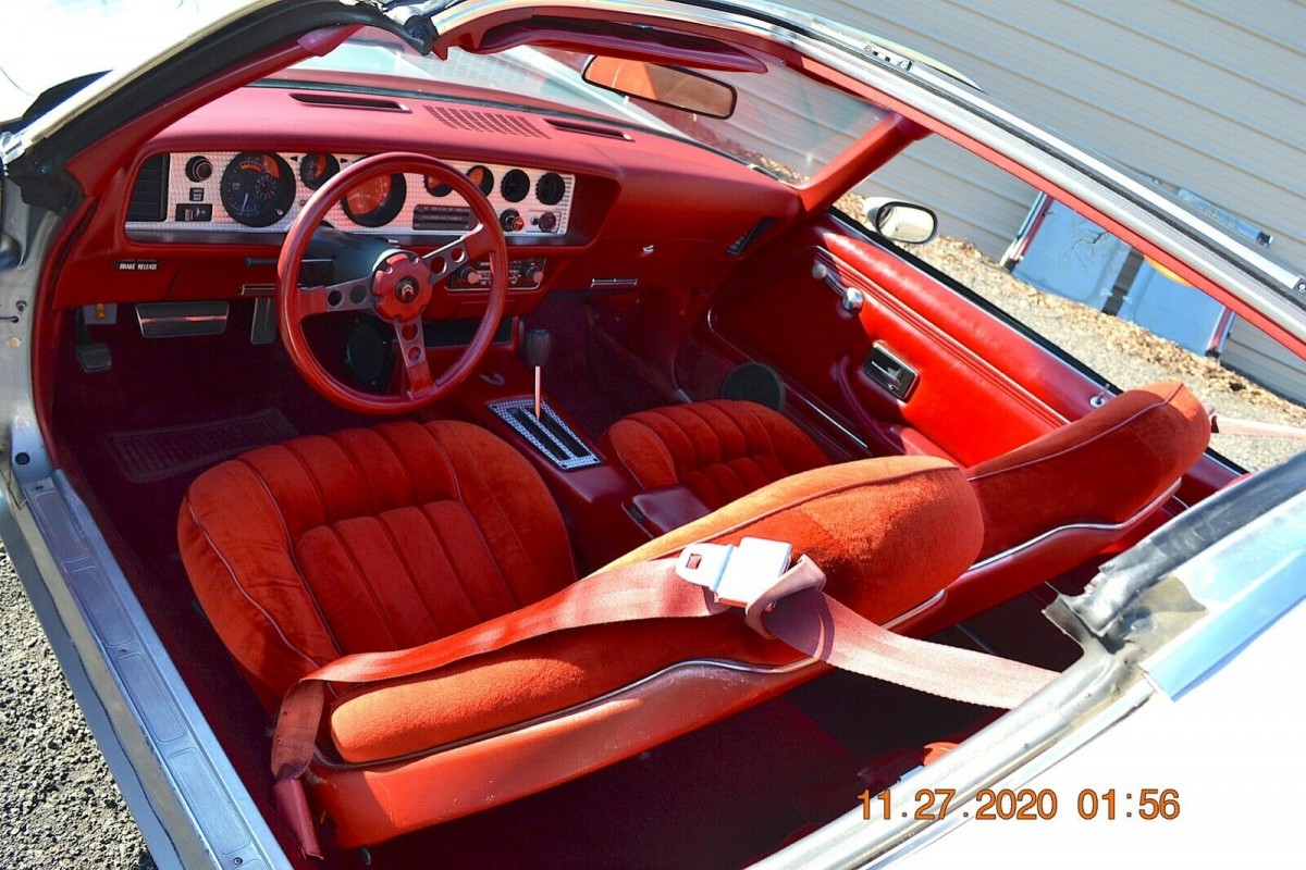 The other thing I find odd is that they state it has a W72 400 V8 – but they only installed those in 4 speed stick shift cars. The lower compression 7.7:1 400 cu in V8 (180 hp) was installed in cars with automatic transmissions in 78. i.e. the same engine you could get in a Bonneville or Catalina. The W72 had 8.1:1 compression, which gave you 40 more HP (220 hp). I’ve also never seen a velour interior with that style seats in a Trans Am. Maybe they offered it but I’ve never seen it.