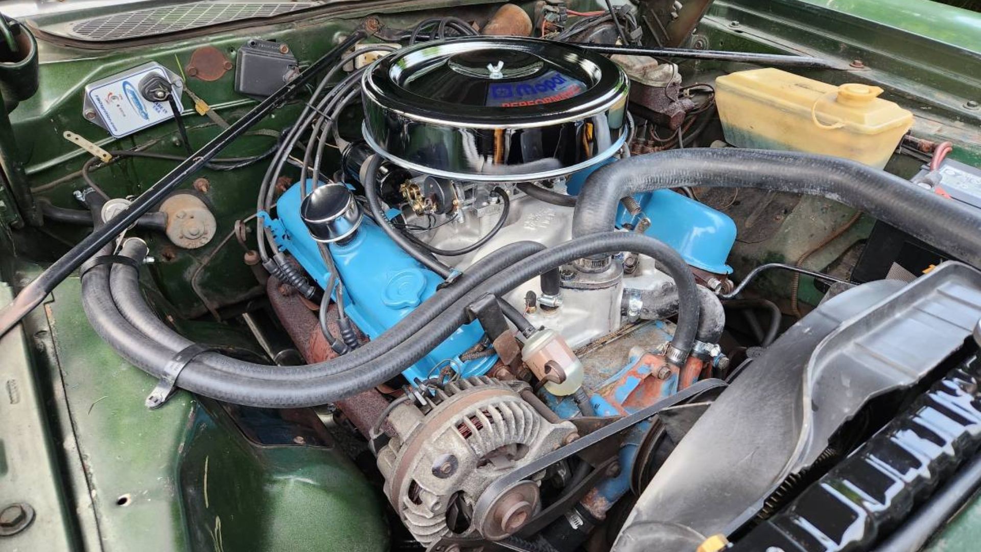 Power comes from a 318 V8, which has been treated to a tasteful and reversible performance upgrade. It now breathes through a period-correct Edelbrock four-barrel setup on a port-matched LD4B intake with factory-style mechanical kickdown. It also benefits from a full dual exhaust system by Accurate Exhaust, electronic ignition upgrades, and a correct-style chrome air cleaner. Power is sent through an upgraded A727 automatic to a 2.71 Sure-Grip rear.