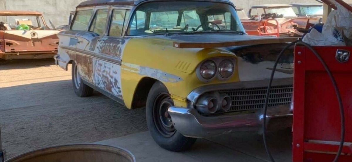 It looks as though most everything this Chevy was built with is still there (except the wheels), although duct tape is required to hold things like a rear taillight in place. Rust may be mostly of the surface variety, but we don’t get a glimpse of the chassis or under the hood and what little we see of the interior suggests at least a partial restoration is needed. While these later Nomads won’t command the intergalactic price tag that some of the 1955-57s do, Hagerty suggests a ’58 in top condition could be a $30,000 automobile.