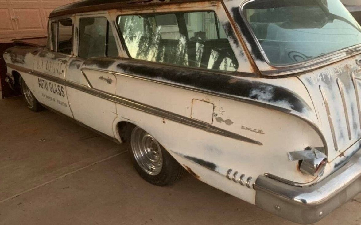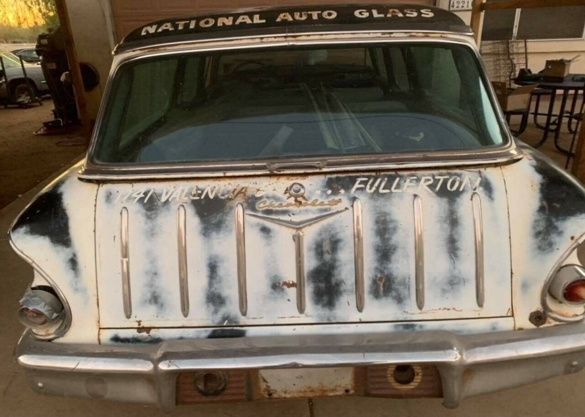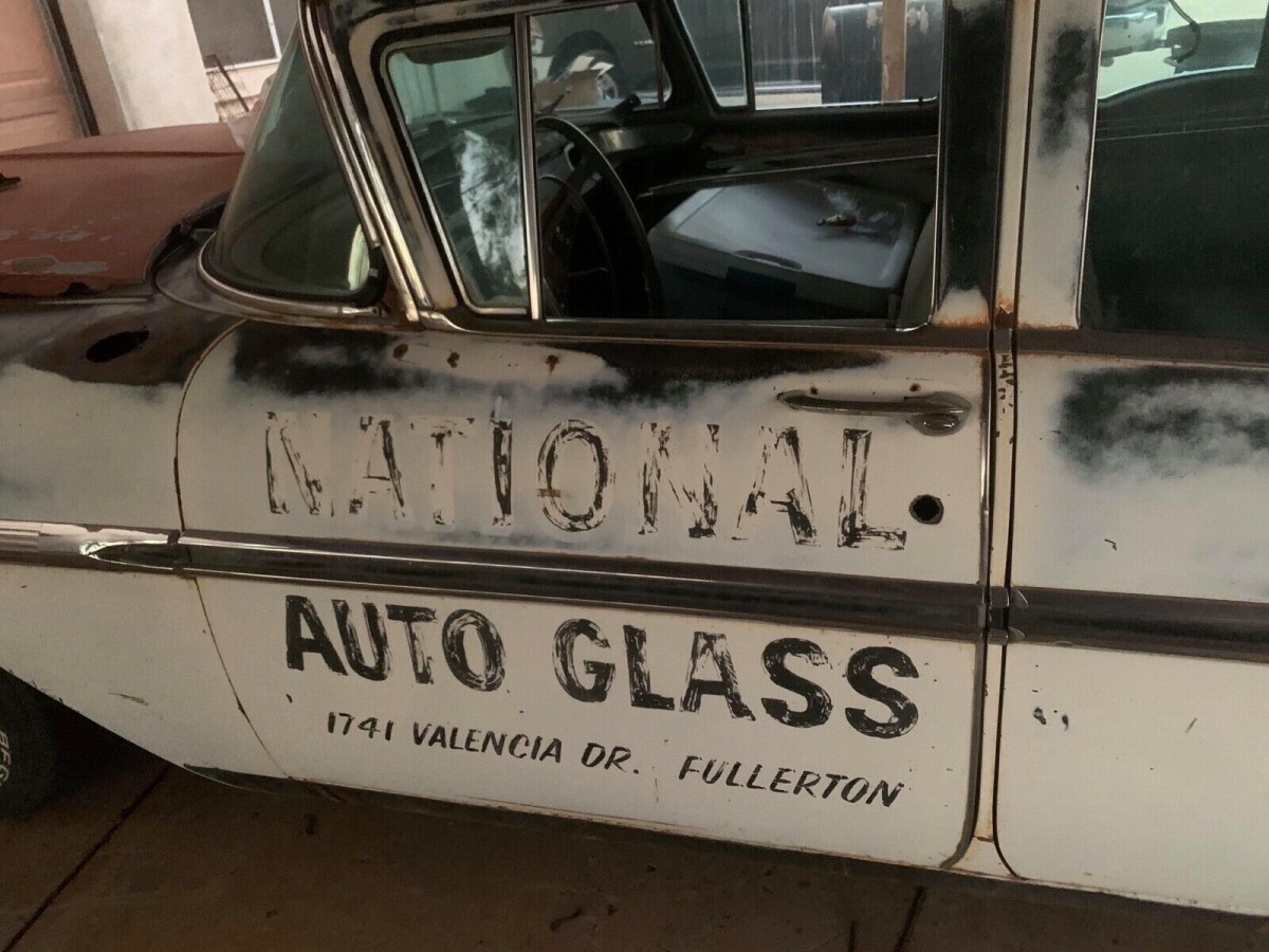 Loads of patina are present on the wagon, which is mostly white but faded and some dark blue is revealed, perhaps a two-tone applicable. Once employed by National Auto Glass in Fullerton, California, traces of those graphics are still present and it would be cool to keep them. However, the passenger side front fender is bright yellow, suggesting a fender-bender required a trip to the junkyard to source a replacement. The front bumper is also bent slightly in the same general area.