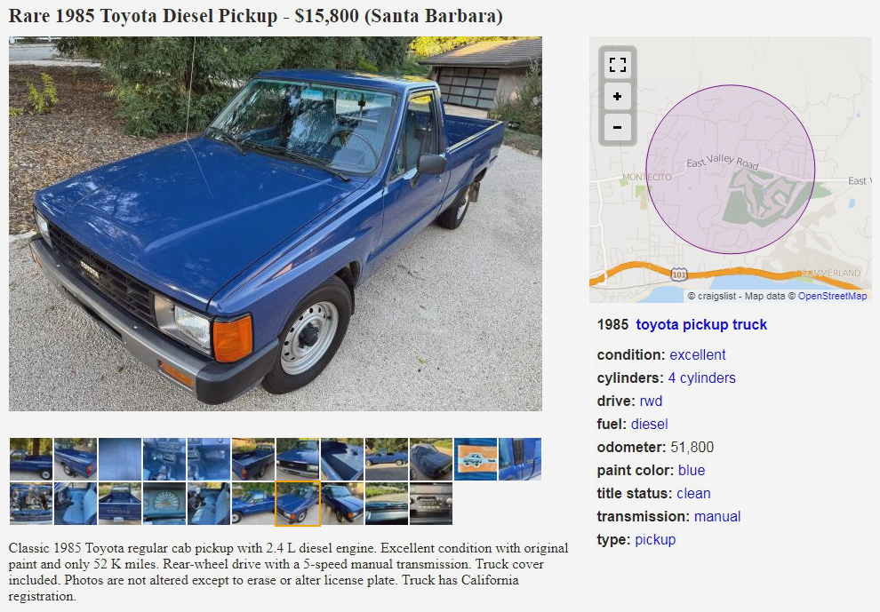 Medium blue, check. Long bed, check. 5-speed manual, check. Diesel engine, check. No rust, check. Original paint, check. “Excellent” condition, check. This 1985 Toyota diesel pickup has it all, unless a person wanted 4WD or the Xtracab model. It’s also priced as if it had it all at $15,800. The seller has it posted here on craigslist in Santa Barbara, California. Here is the original listing, and thanks to Barney for the tip!