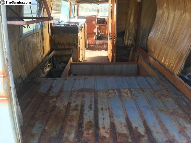 Last registered in 1980, this bus has been stretched about 2 feet making it about 17 feet long. The interior is in poor condition with the camping amenities mostly removed. The roof piece is made of fiberglass and is in bad shape. The engine appears to be a 40 horse and it does run. The floors and cargo area have rust. Judging by the limited pictures, there is quite a bit of rust but compared to other buses for sale its not that bad.