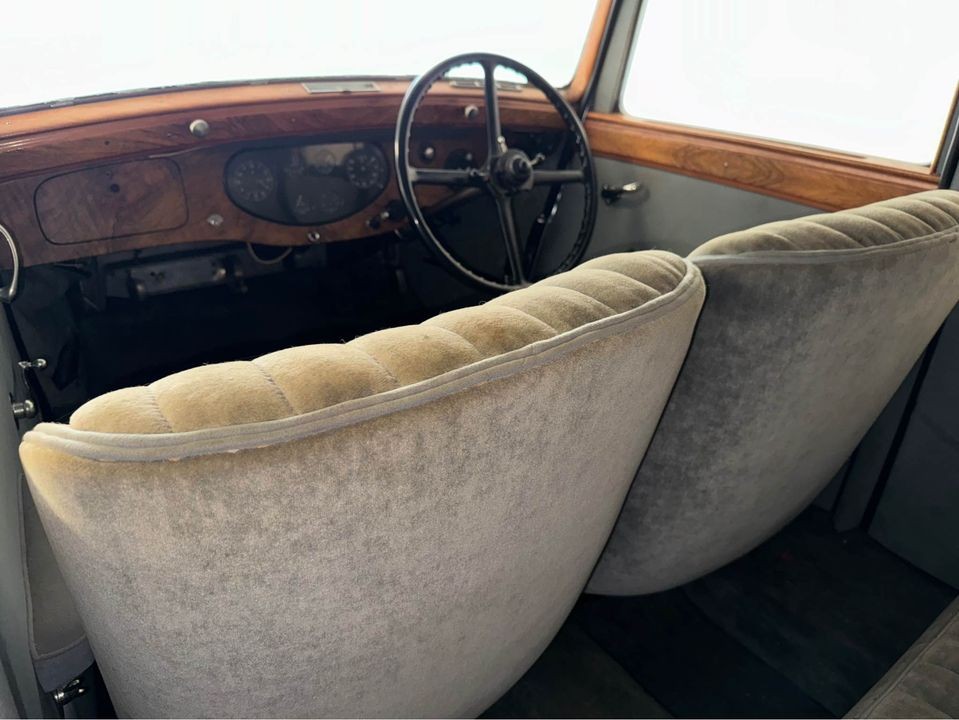 The interior will remind you this is a luxury car, with burl-wood door caps and instrument panel, and velour upholstery. Not only is this car right-hand drive, but you will find the gear shift on the right side as well. Rolls tried a central gear shift in the Twenty but was informed by its clientele that the arrangement was “cheap”. The headliner is perfect. This car was driven and maintained regularly until a few years ago when its person took ill; we don’t know its present running condition.