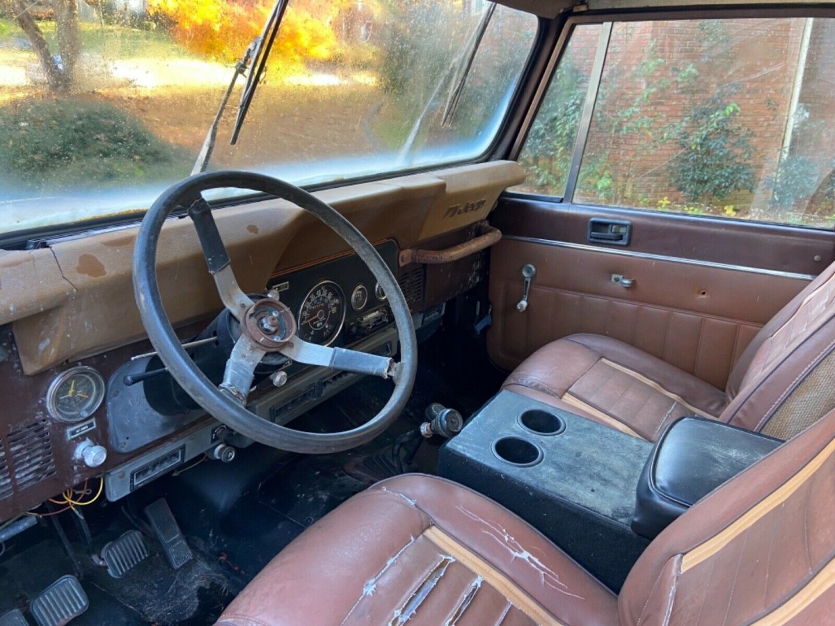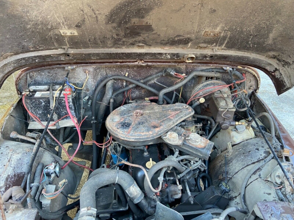 The seller’s truck is clearly an untouched original, and that has its good points and drawbacks. The interior may be complete, but it’s also slightly tatty with seats showing plenty of signs of wear and tear and a steering wheel that may not be original and is also missing its hor ring. The dashboard looks to have either been cut or has cracks and there’s a few spots of discoloration; fortunately, you should be able to find a replacement dash pad without too much searching. The seller notes it is equipped with power steering, power brakes, and dealer-installed air conditioning, but that the compressor has gone missing. The seller holds a clear title, and claims to have had the Jeep running with an external fuel source.