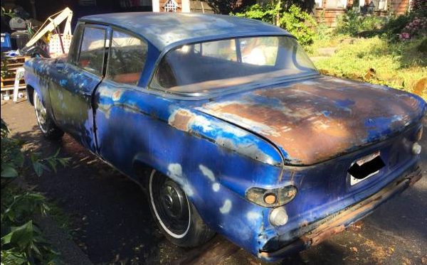 That could be original paint. If you wanted a white top on your Lark this is what you got. The bumpers and trim are included with the sale, but there’s no word on the tail lights. The surface rust is described as light. The running gear should be the same on a lot of Studebakers so the axle shouldn’t be hard to find. The taillights may be more difficult. At $2300 it looks like it wouldn’t take too much to restore this to a driver if there’s not too much rust. It will be interesting to see what you think of this Lark.