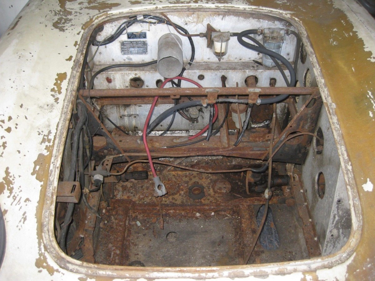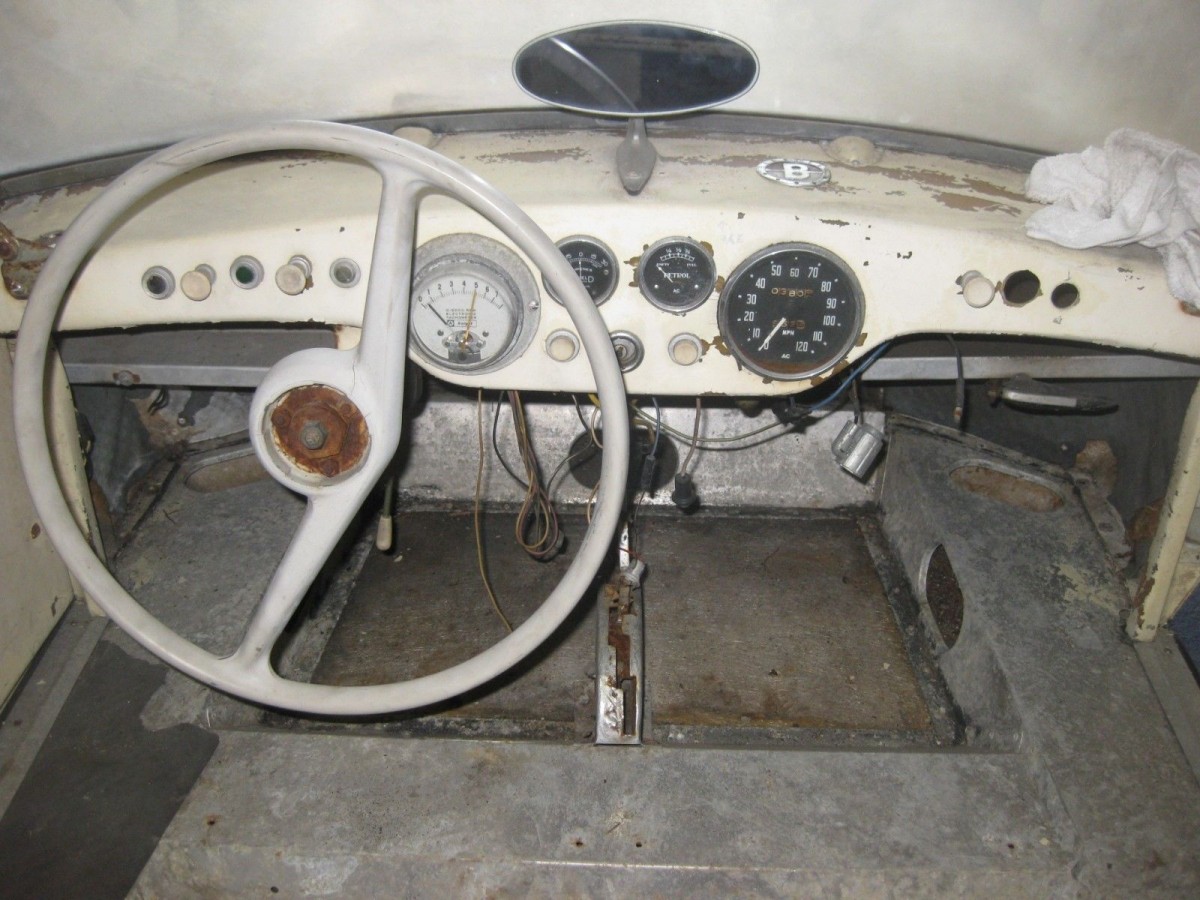 We do not have any photos of the interior furniture, side curtains or top, so a bidder would be wise to ask if the pieces are with the car. The dashboard has gauges made by AC, which is unusual for a 1950s British car since Smiths was the dominant instrument maker in the UK at the time. The tachometer is most likely not what the factory installed since it looks like it is an industrial unit. The floor shifter is out of the car but the gate shows the notches for a sequential-type gearbox.