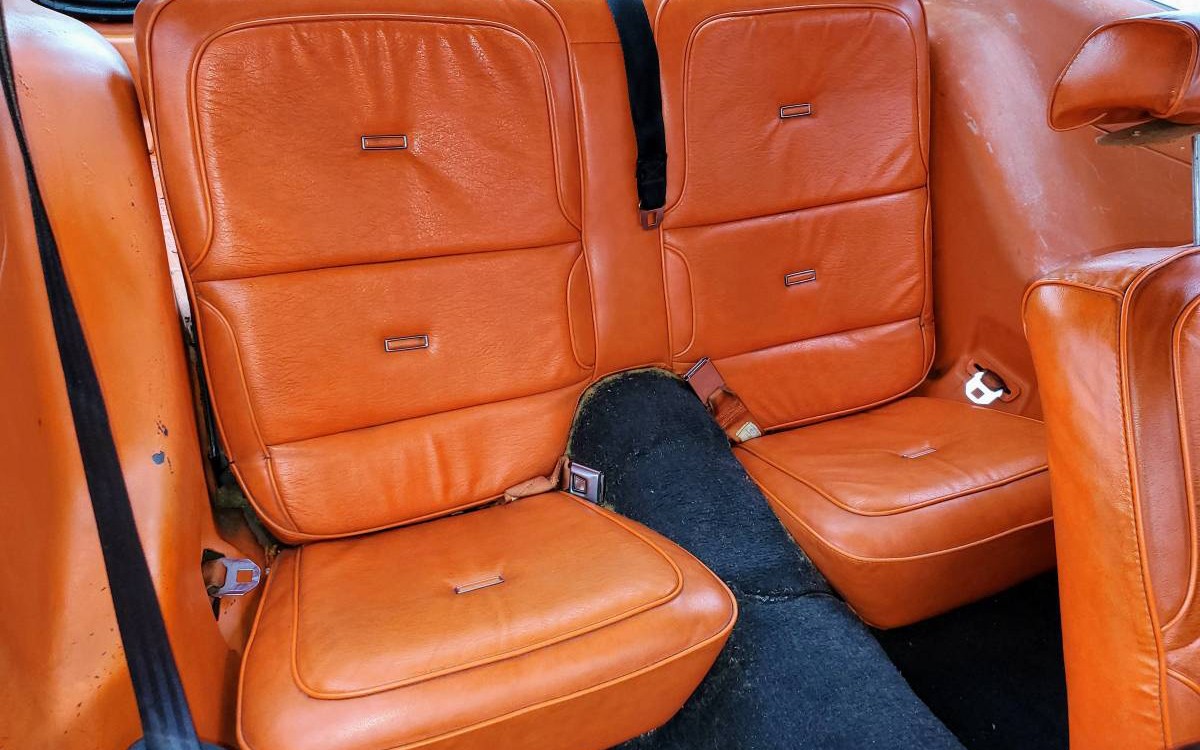 Since there is no engine photo I’ll show you the almost-perfect-looking rear seats and (Caution: sunglasses needed) the orange headliner! I know, that’s bright! The unseen engine is the famous 2.3L inline-four with 88 hp. The automatic transmission makes it one second slower to 60 mph than a 4-speed car, but sometimes it’s better to cruise along in an all-orange car than to speed through life in anything else. Is this one too orange for you or are there others out there who like orange cars?