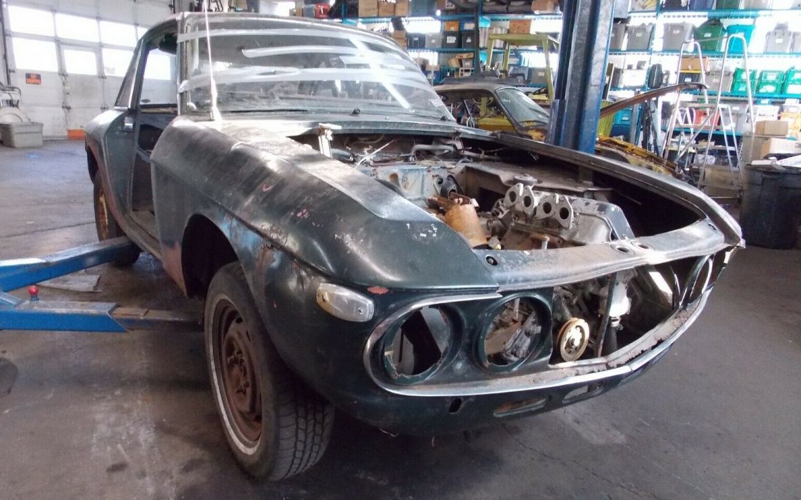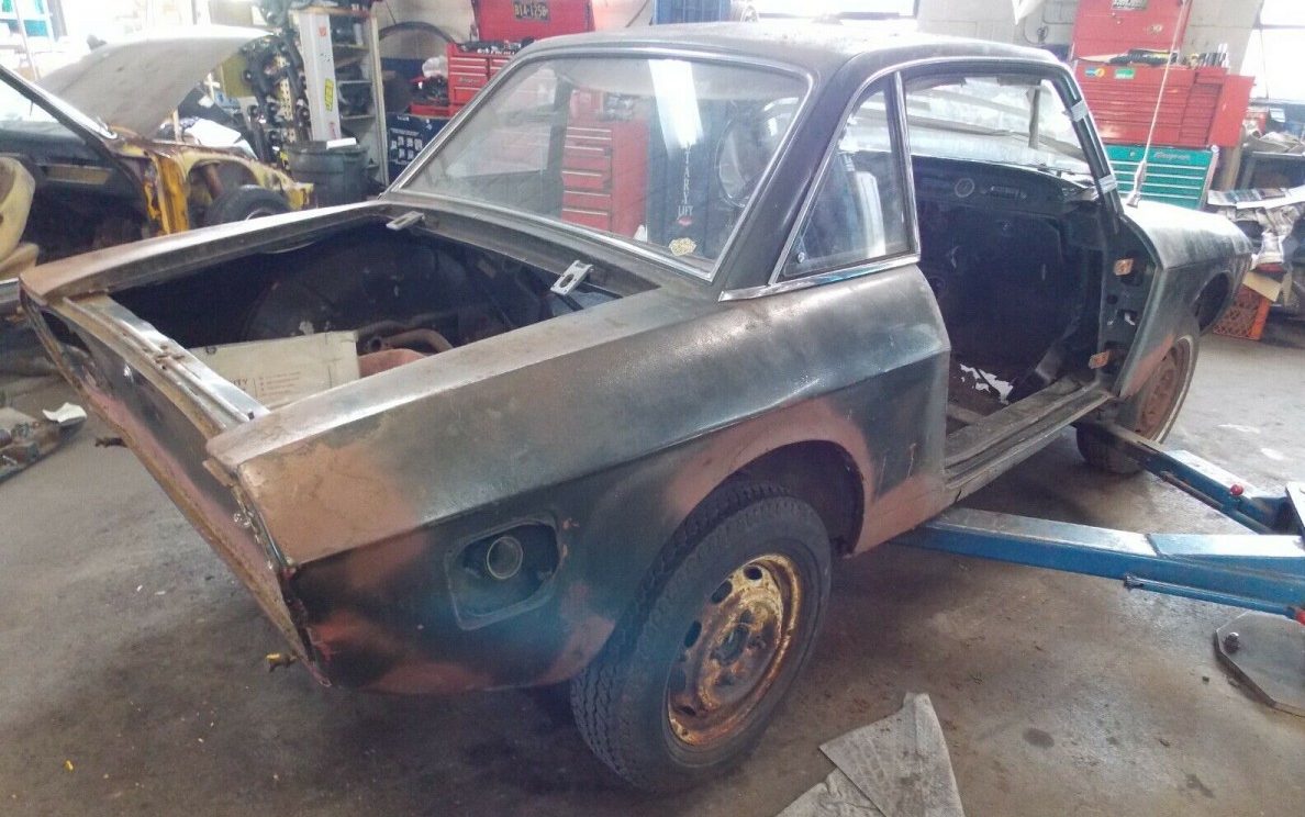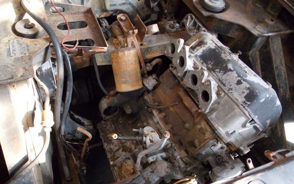 The 86 HP, 1.3-liter, in-line 12 degree (single cylinder head) V4 four-cylinder engine has been pretty well stripped and there is a pile-o-parts that are included with the short block assembly that, according to the seller, will not turn over. The gearbox is a four-speed manual transaxle as this Fulvia is front-wheel drive. The seller mentions that the suspension has been “cobbled together” to make it roll.