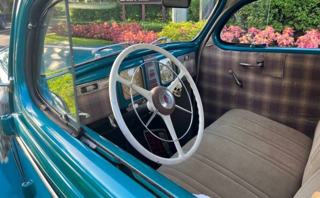 From 1940 to the early 1950s, Chrysler offered a “Highlander” interior package that evoked Scottish plaids, and they were a popular and interesting option from a time when interior patterns were fairly uniform and drab. It appears that a past owner/upholsterer found some inspiration in those later models and trimmed the door panels and dashboard of this ’38 with a plaid motif. None of the examples of 1938 Chryslers I’ve found online sport a similar pattern, so we’ll say it’s another tasteful custom touch. On the other hand, the “skull” shifter knob has got to go; there is nothing intimidating about a turquoise six-cylinder Chrysler.