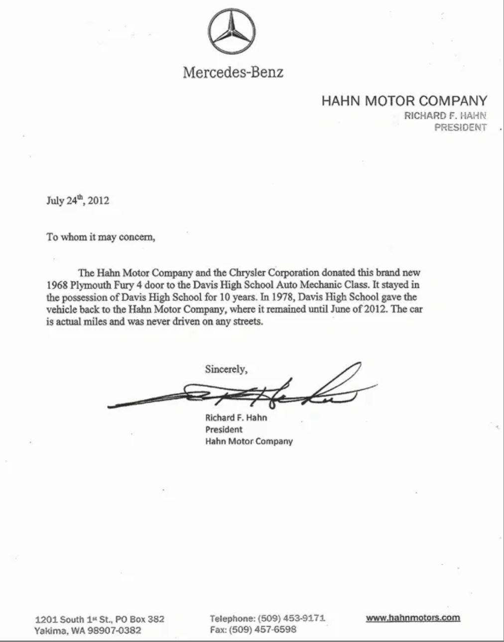Buyers could choose from a fair selection of engines when ordering their VIP back in 1968. Given this car’s history, it is no surprise to learn that it was delivered with the entry-level 318ci V8. This is backed by a 3-speed TorqueFlite transmission, while the vehicle also features power steering and power brakes. With 230hp on tap, the Fury would be capable of a 17.6-second ¼-mile ET. A life spent training students means that the Plymouth has probably come in for its share of mechanical attention. It isn’t clear how comprehensive this would have been, but if most of the drivetrain has been out at some time, that wouldn’t be a surprise. After returning as a display vehicle at Hahn’s in 1978, the car sat for 34-years. It was treated to a major service in 2014, which cost $3,470. Receipts for this work are included in the sale. As well as the original Owner’s Manual, a letter from the President of Hahn’s is included with the vehicle. This letter confirms its history, and I have included a shot of this in the photo gallery at the bottom of this article.