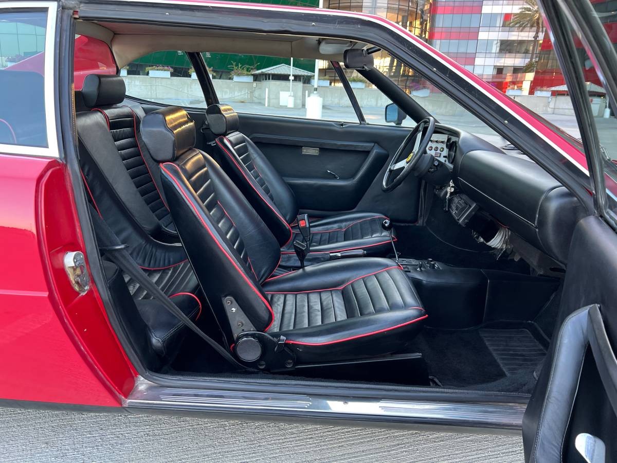 The Dino 308 GT4 stands out for another reason, which is that it was styled by Bertone rather than Pininfarina. In the world of Ferrari, this was a major shakeup at the time. The shame of it is that this was a very pretty design unfortunately marred by the awful U.S. safety bumpers, which as you can see here, are hanging off the car slightly askew. If you happen to see the European-market cars with their slim chrome bumpers, you’d be amazed at what a difference it makes visually. The seller reports that this example retains its original books, tools, jack kit, jack bag, manual, and records, which unfortunately did not include any evidence of a belt service and carb adjustment.