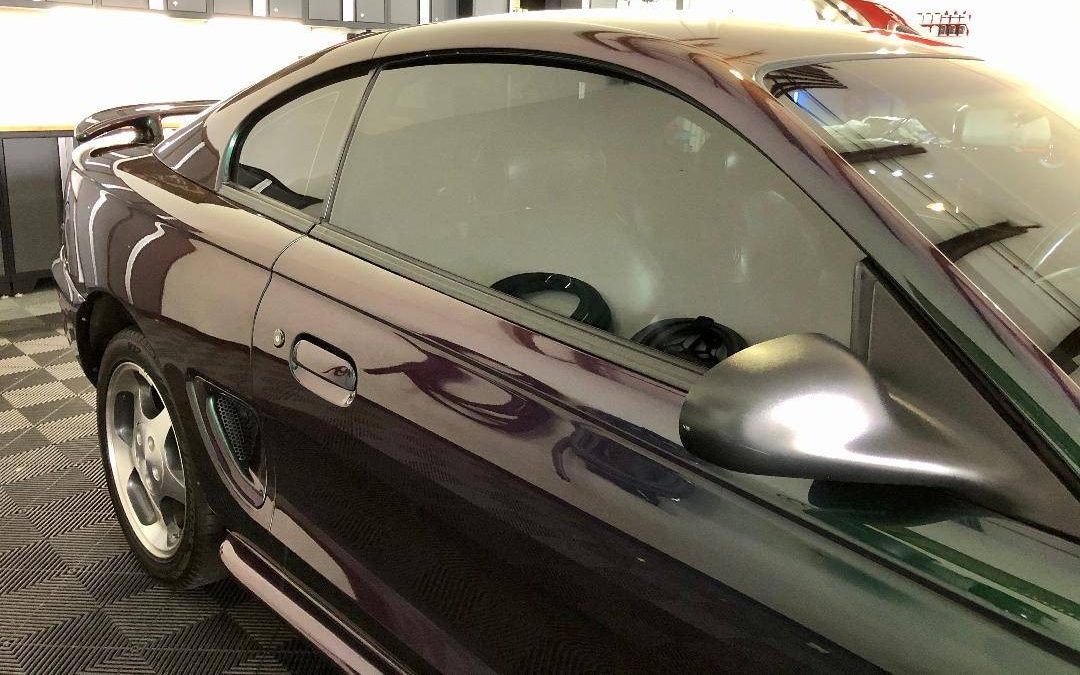 From the side angle, we can see the Mystic paint in action. The color was formulated by BASF and will shift between green, gold, purple, and other colors depending on light and the direction you’re looking at it. Only available on the Cobra in ’96 the paint is eyecatching and subtle at this same time, only 2000 Mystic Cobras were built. There is even a registry for Mystic Cobras that has some great information about these cars.