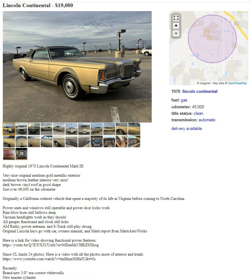 All that gushing about the seller’s photos means nothing if the car is a (insert lame car here), but this is a 1970 Continental Mark III in seemingly outstanding condition, in a great color with a great interior and a clean engine. To make it even more enticing, their asking price may be on the lean side according to Hagerty. Hagerty is at $13,900 for a #3 good-condition car and $31,600 for a #2 excellent car. If this car is between those two, condition and value-wise, that would put it at $22,750.