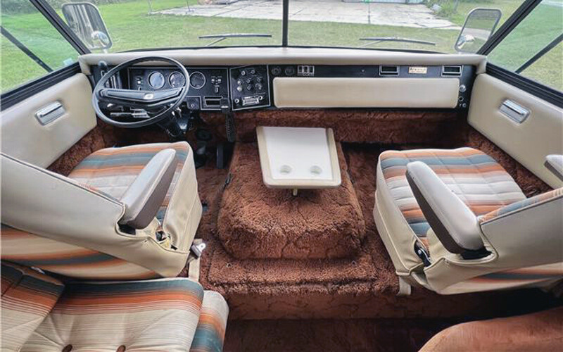 One thing about this era of motorhomes is that they typically don’t have a separate driver’s door, so you’re crawling over that sculptured shag carpet every time you head to or from the driver’s seat. The passenger does the same thing. For the record, the seller says that everything is original, right down to that shag carpet, which we may or may not have had in our house in this era… (ok, we had it)