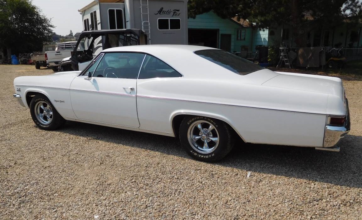 We’re told this ’66 SS is a local car that still resides within a few miles of where it was first purchased. No mention is made as to how many owners it may have had, but it’s been well treated over the past 56 years. The body and paint look quite nice, and nothing is said about the finish being original, so we’re guessing the white has been reapplied at least once. The red bucket seat interior all appears in fine shape, though there may be a problem brewing with the seat cushion on the driver’s side.