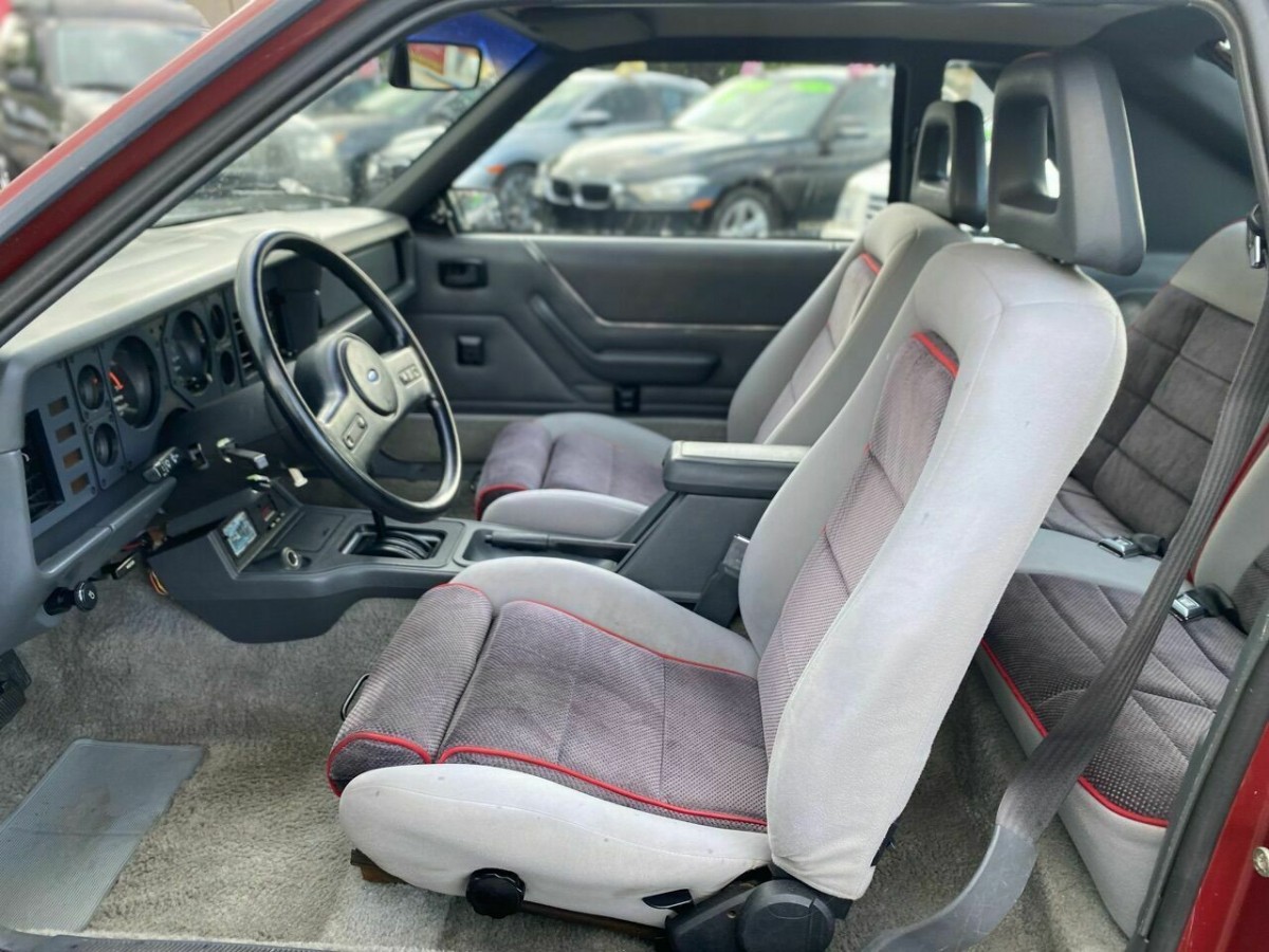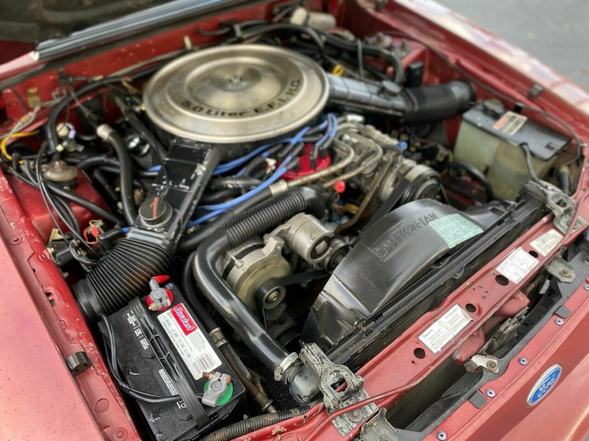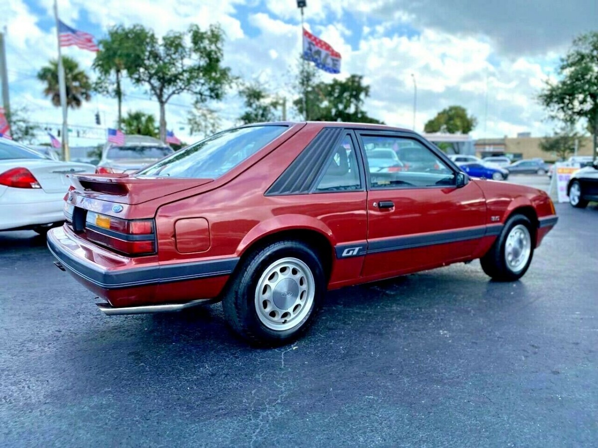 The ruby red paint appears to be in excellent condition, as it gleams nicely in the Florida sun in the photos. The dual exhaust does look like the factory set-up, and the listing makes no reference to it being swapped out for an aftermarket setup. The GT badges on the lower rear quarter panel are one of my favorite featured of these earlier cars, and I wish Ford had continued to use them on the later Fox-bodies. There’s zero evidence of any troublesome rust in vulnerable spots like the fenders or lower sills, so I’d say it’s safe to call this one a rust-free example. The windows retain factory tint and haven’t been blacked out like so many other Florida cars, and it reminds me how much I prefer the light-touch approach to tinting.