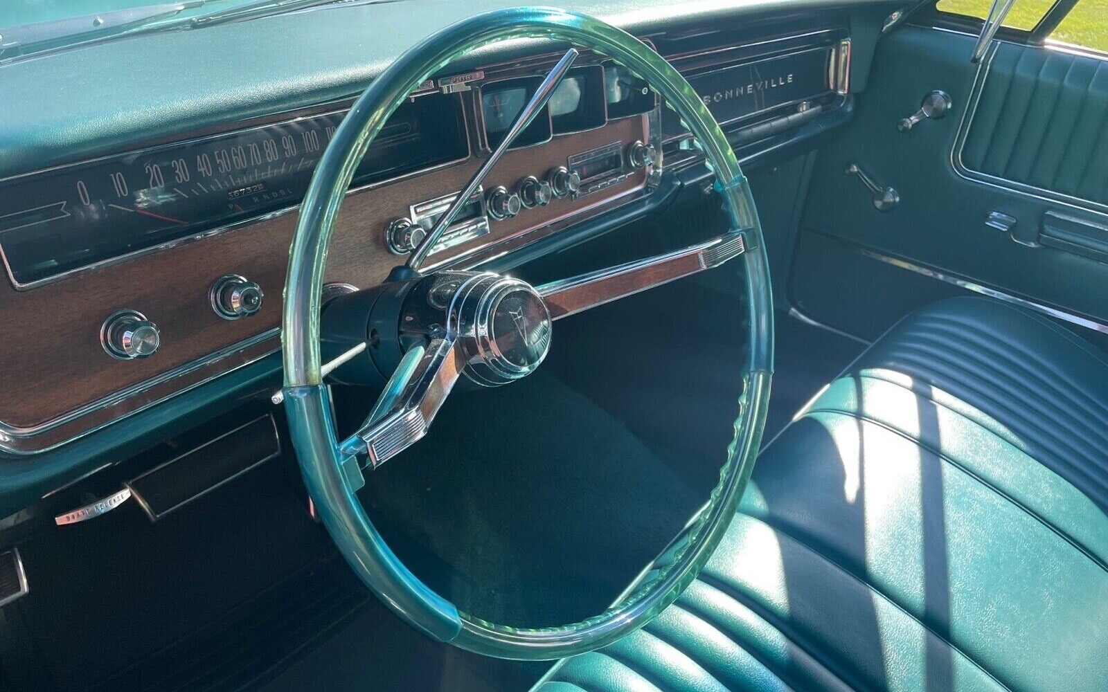 ’65/’66 full-size Pontiacs did not have a horn ring … the 2-spoke steering wheel in this Bonnie is correct.