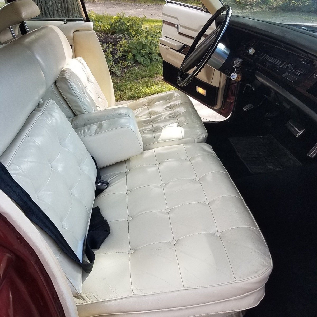 The white leather interior is in great shape for the car’s age. There is some cracking and yellowing in the leather on the driver’s side, but some of that might be remedied with leather conditioner. As befitting a car of this stature, it is loaded with features such as power windows, power door locks, cruise control, and an AM/FM radio with an 8-track tape player.