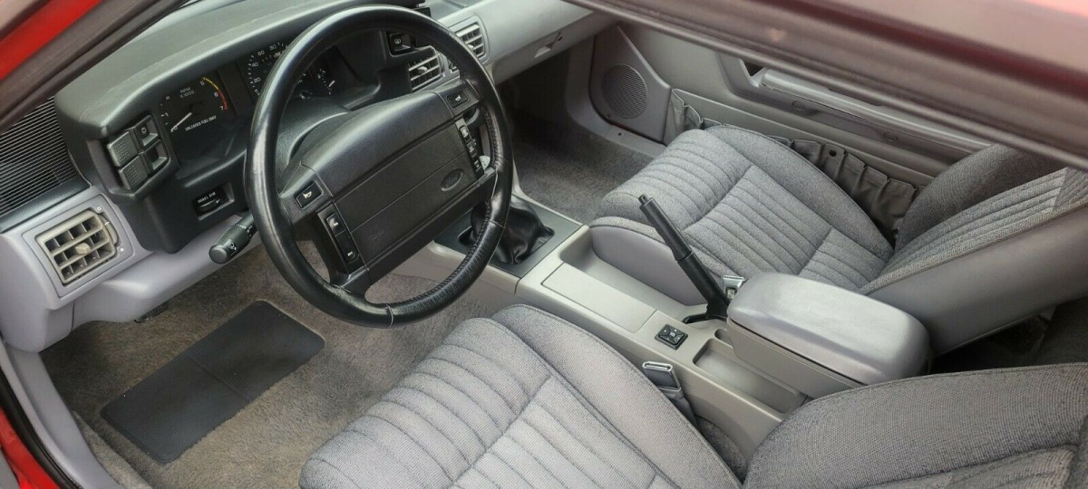 The interior is in excellent condition and certainly looks like it belongs in a car with as low mileage as this one. The sport bucket seats are trimmed in gray cloth, and red over gray is a great look for a Mustang (or any performance car, really). The console is in excellent shape as are the door panels. The map pockets look like they haven’t lost much of their elasticity, another measure of determining how accurate the odometer rating is. The carpets look just as clean, and really the only thing I’d change in a cockpit like this is losing the stock airbag steering wheel for a sportier three-spoke job. The seller claims this is a real-deal two-owner car and that everything works inside.