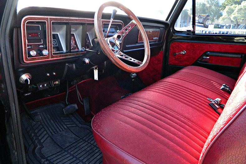 A good condition interior is difficult to replicate in a vehicle from this era. Restoration parts often fit, but never as good as factory components. So to see an interior this crisp and well-fitting is really a treat, as many of these trucks haven’t come anywhere close to surviving as well as this 1978 model. There are a few modifications, like the steering wheel, and the controls for the dump bed and the off road lights. Modern floor mats protect the original carpet, and the door panels and bench seat are in wonderful shape with vibrant color. The dash and gauges are a joy to see as this may very well be one of the nicest surviving dashes for this body style of Ford pickup.