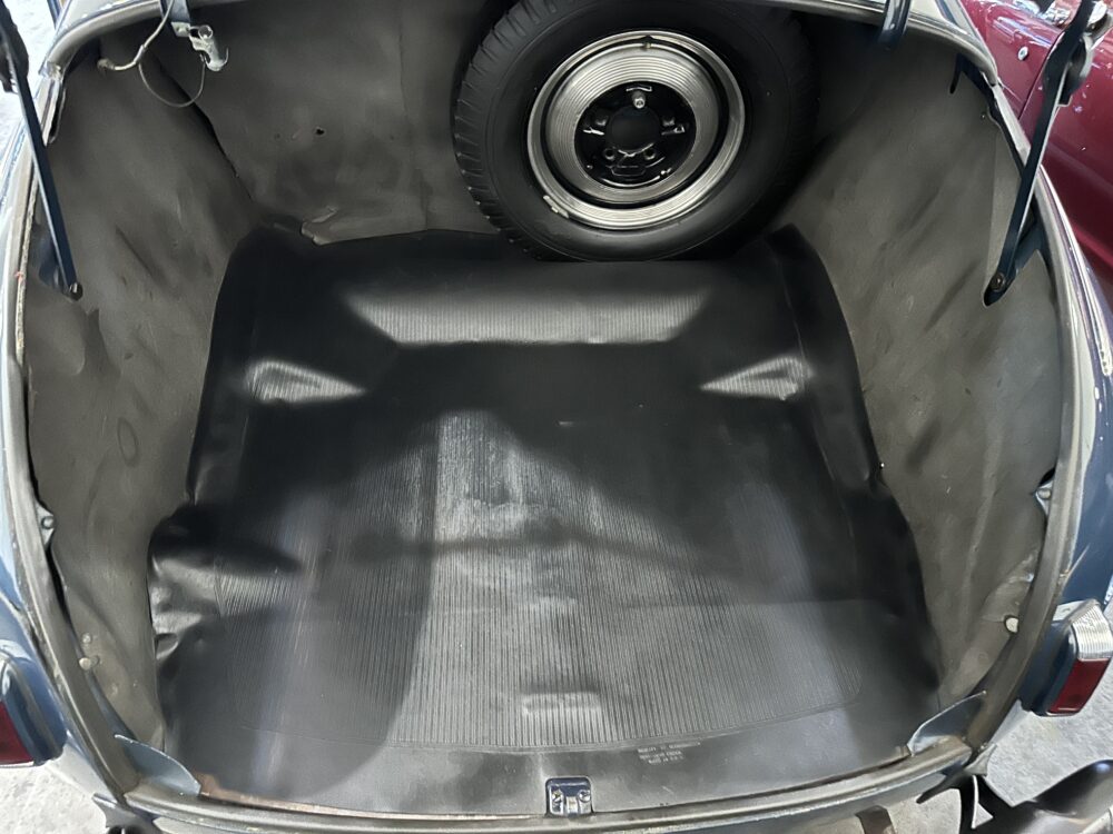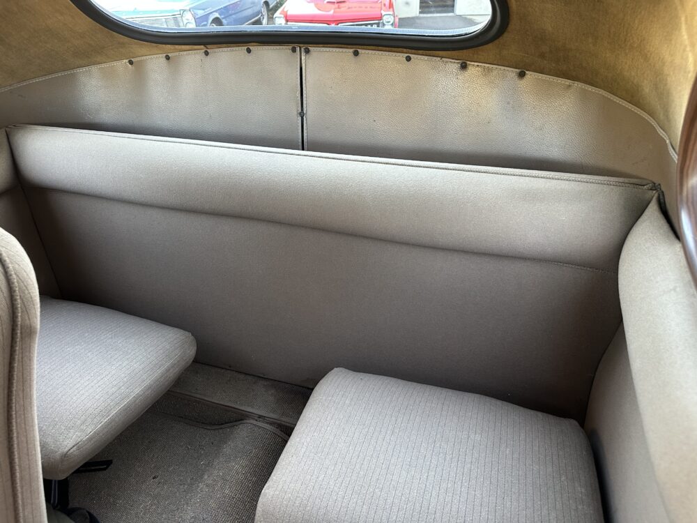 With its original upholstery and faux wood-grain dash still in great condition, we can see how the De Luxe differs from a Super De Luxe: no horn ring, no driver’s door armrest, no clock, no crank on the dash vent. But here’s the money shot, showing those rear fold-up seats. The car’s trunk is as spiffy as the rest of the vehicle.
