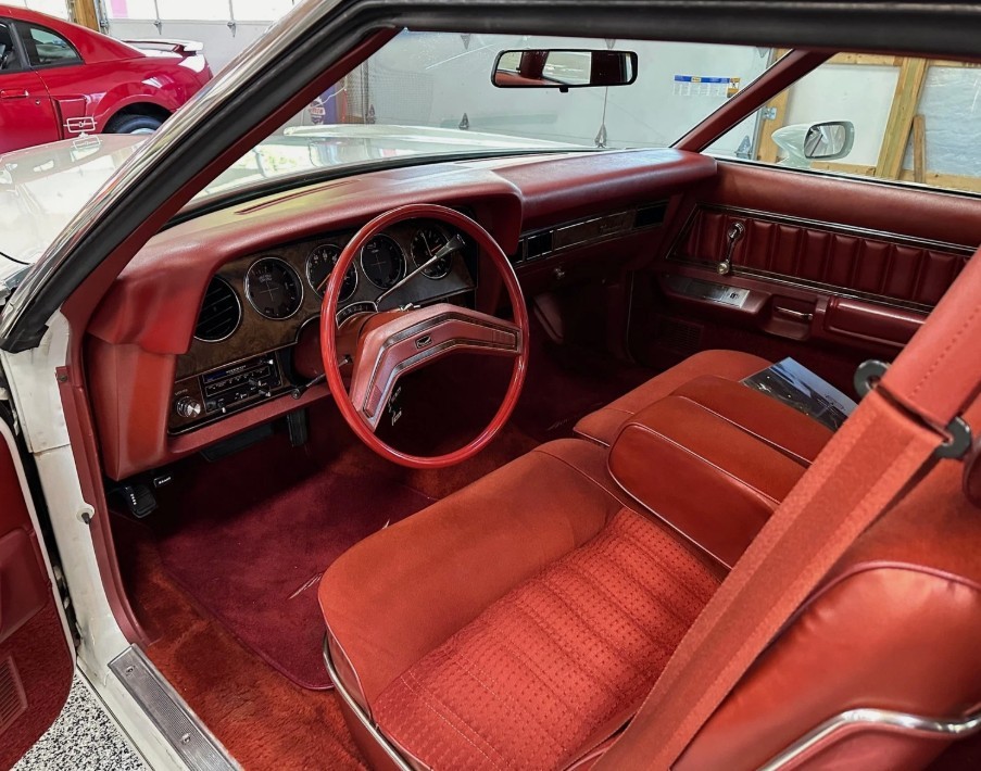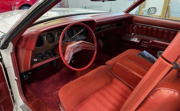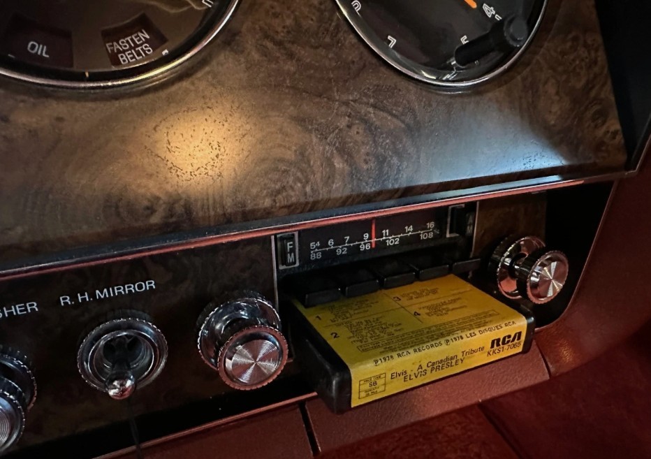 Exuding ’70’s style, the interior offers acres of plush seating accented by a matching steering wheel, dash, armrests, and door caps. The requisite faux wood trim around the instruments is a reminder of its luxury niche. The eight-track has Elvis Presley’s “Canadian Tribute” queued up for your listening pleasure. You know how seat belts rough up over time as you pass the material through the clasps over and over? Well, these look perfect. The cabin appears like it should still smell new.
