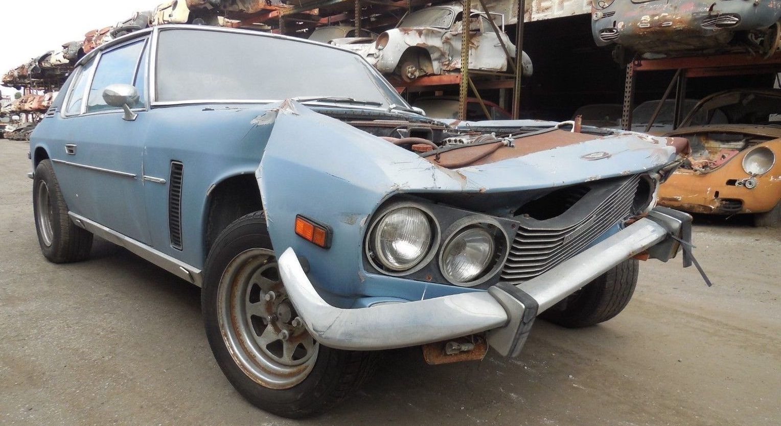 Don’t you just wonder how rare a Porsche is when you see this many sitting on the racks behind this Jenson. If I had bought one of the crusty wrecks I’ve seen on here for big bucks I’d be crying right now. As for the Jenson the nose looks like it got hit pretty hard but it is clear to me the front wheel got missed, and it looks to me like the frame and suspension are un damaged. This car is definitely repairable if it could be had for a low enough price. I’d say that you would need to get it for 3 to 4K to make it worth fixing, once pulled apart I think most of that sheet metal could be repaired but the right guy has to want to take it on.