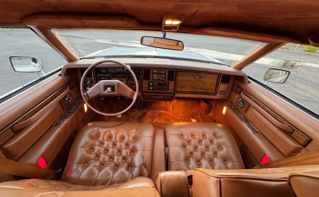 The interior screams “Cadillac” – with tufted upholstery, enough cabin lighting to conduct a heart transplant, plush carpeting, a new headliner … and everything is said to work “perfectly”. The air conditioner unit has a new compressor and new lines – no word on whether it’s been recharged with modern refrigerant but this owner is meticulous so it wouldn’t surprise me if he’s thought of that, too. The trunk is as nice as the rest of the car. Stylistically, the gauge arrangement reminds me of a kindergartner’s drawing with its oddly sized squares all over the place – but that was the idiom in the early ’80s.