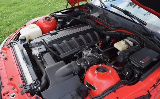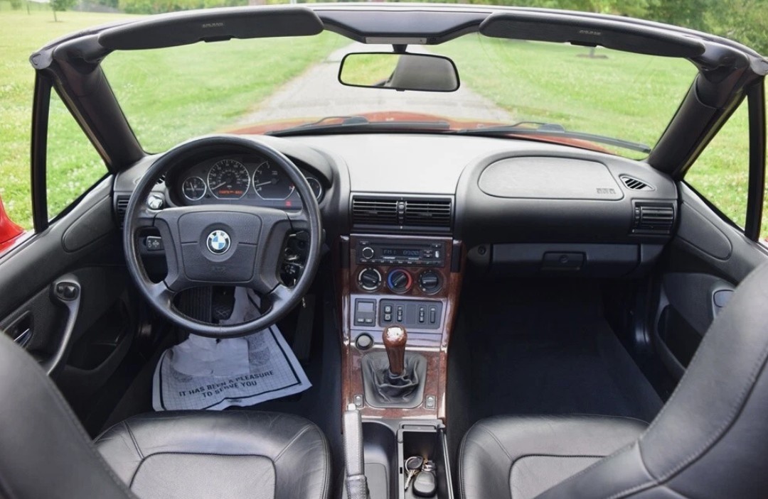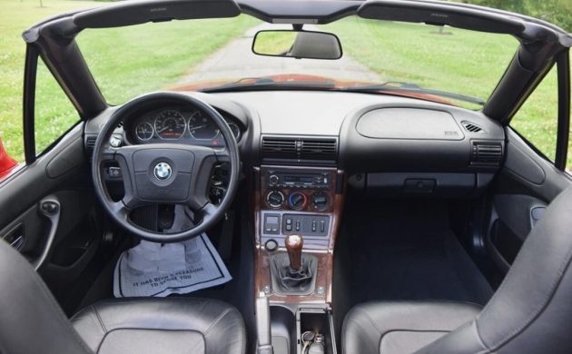 The interior is lush, with well-designed black leather seats, wood accents on the console, and three big, round gauges peeking through the steering wheel. Drivers praise the Z3’s ergonomics – everything seems to fit. The car can be optioned with a wind deflector, designed to limit noise and tousle on long top-down road trips. The top is in fantastic condition, and the trunk is spiffy-clean. Very close scrutiny reveals just a hint of wear on the driver’s outside seat bolster – otherwise it’s difficult to fault the cosmetics. Two sets of keys and the owner’s manual/service book accompany the sale.