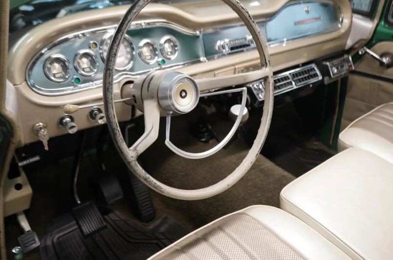 The seller indicates that International’s top-of-the-line motor sits in the near-immaculate engine bay – a special-order 345 cu. in. V8 making about 168 net hp and a ton of torque. These motors are heavy-duty workhorses that will run forever, but you might need a second job to pay for its gas: with a tailwind, it might achieve about 10 mpg. The transmission is a four-speed manual, and it’s equipped with factory air conditioning. The truck drives well and was recently serviced – important of course, but take a look at the underhood insulation, and what we can suppose are factory markings on the panel. Pristine! That radiator hose might be original. Yes, it’s probably hard as a rock, so carry a spare…. The wiper washer bottle is missing.