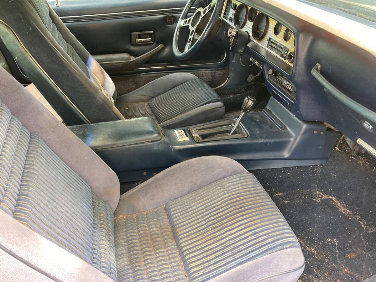 The deluxe blue interior looks like it could be cleaned up and saved. The dash does not appear to be cracked or damaged. I cannot tell if the factory dual post radio has been replaced. The car has factory Pimlico cloth seats which were a one year only material. Additional options include air conditioning, tilt steering, T-Tops, and power windows. One distinction of the 1981 Pontiac Trans Am and Formula is that they all received a Firebird emblem on the rear tail light door to access that gas filling tube.
