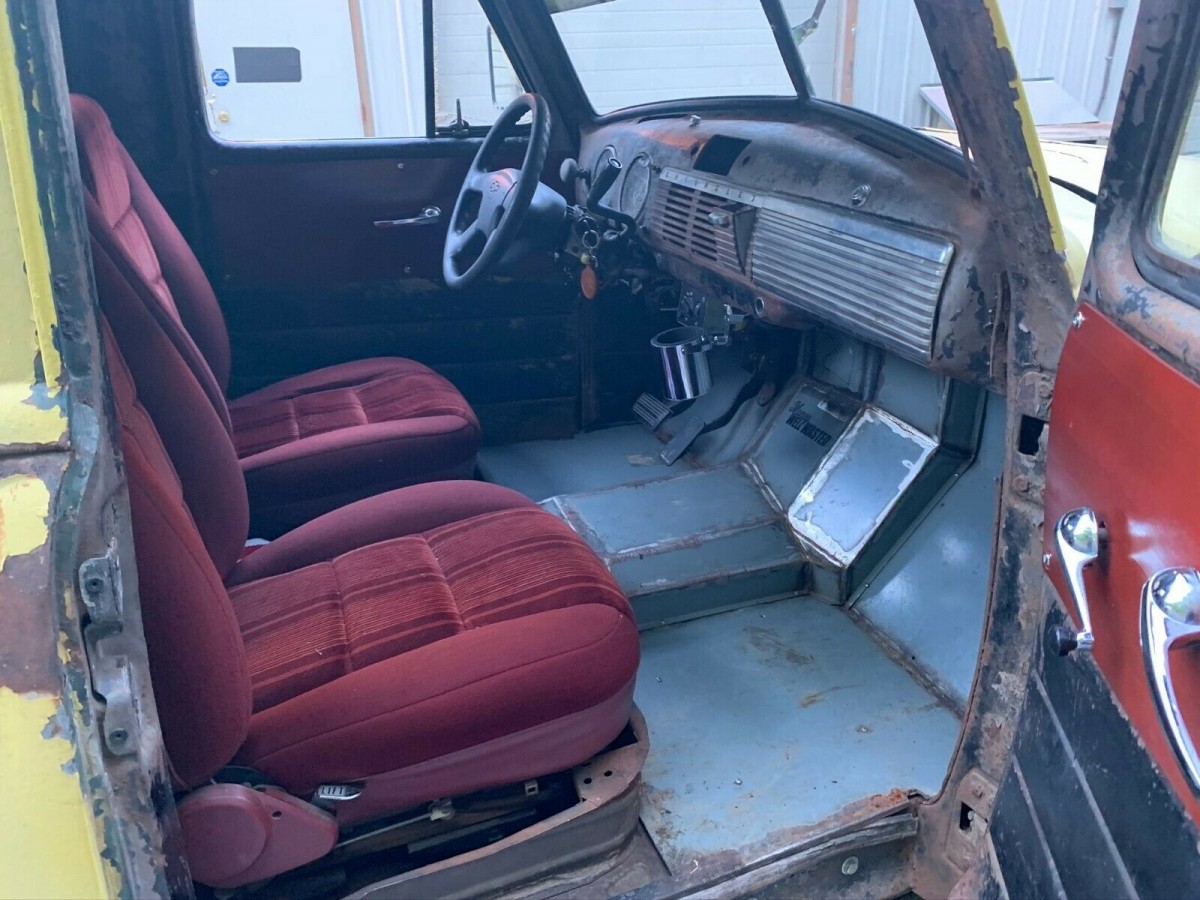 The 16″ wheels look great and really make the truck look like a pro touring vehicle. The LED headlights are a nice upgrade and the glass looks good all the way around. The exterior paint is yellow in most places but the seller probably put some effort into the patina look. The bed is wood and the frame is said to be structurally solid.