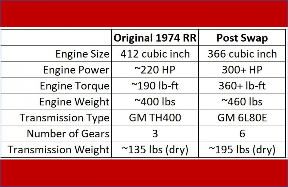 I put this table together based on internet information, so take it with a grain of salt, but it does illustrate that the LS/GM6L80E seems to bring a pretty nice performance enhancement to the Silver Shadow. I doubt that the minimal weight increase would affect the suspension greatly. The increased horsepower and doubling of gear ratios should improve the original car’s 0-60 time of 11.0 seconds.