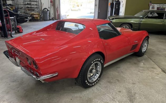 The 1972 model year marked the end of an era for the C3 Corvette. The chrome front bumper, vacuum-operated wiper door, and removable rear window would all disappear at the end of the year, representing the most significant changes since the C3’s introduction. To describe this Corvette as stunning wouldn’t be an understatement. The Mille Miglia Red paint holds an incredible depth of color and shine, cloaking fiberglass that seems to be free from flaws and stress cracks. Disappointingly, the seller supplies no underside shots. However, the lack of visible corrosion in areas like the engine bay suggests that frame or birdcage rust shouldn’t be an issue. The trim and glass look exceptional, as do the beautiful Rally wheels, trim rings, and center caps.