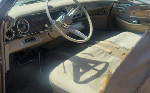 This shot shows the remnants of fins around the tail lamps … so they didn’t quite disappear. Speaking of tail lamps – the bisected lens is a beautiful bit of design work. The ’66 cars are notable for clean styling, with a straight crease all the way from the tail to the tip defining the car’s waistline. That would become a curve as it reached the car’s tail just one year later. The mile-wide trunk lid is a reminder that a lot of sheet metal awaits the refinisher when it comes time for a paint job. Fortunately, the seller notes that the car’s pan and trunk are “good” which I take to mean not rusty. As to value, the money’s in the convertibles, which can sell for $50k. This Coupe De Ville in high driver-quality condition sold for only $16,750 last summer. What do you think of this Cadillac project?