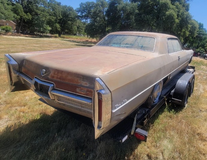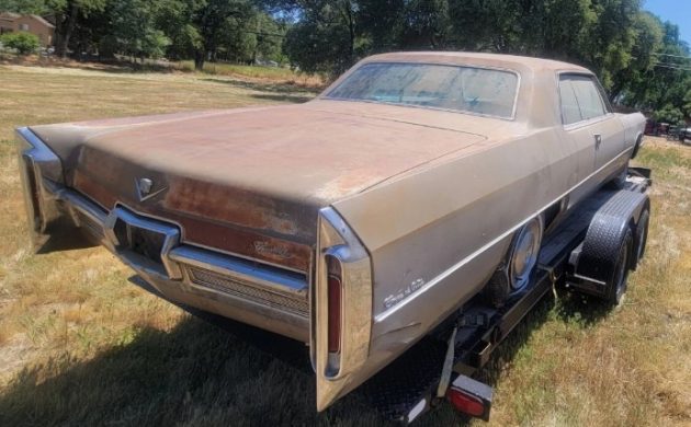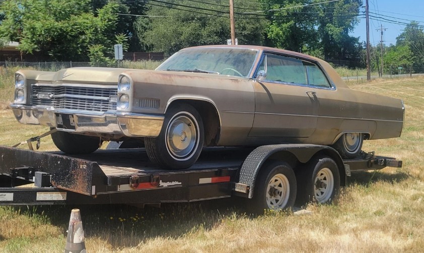 I must admit, I never thought to look for a car at a lumber mill, but why not. Mills have all kinds of mechanical stuff lyin’ around. This 1966 Cadillac Coupe De Ville (and the mill) is located in El Dorado, California, and it’s listed here on eBay for $3000 or best offer. Seeing a formerly swanky car in this state reminds me that not so very long ago, someone ordered this car, and – charged with excitement – drove it home from the lot with reverence. We can imagine the first family ride, occupants breathing the smell of new leather, exclaiming over the graceful ride, the engine’s power, the gleam of chrome. Today, the car is in slightly worse condition than the trailer that supports it. Let’s figure out whether this Coupe De Ville is worth saving.