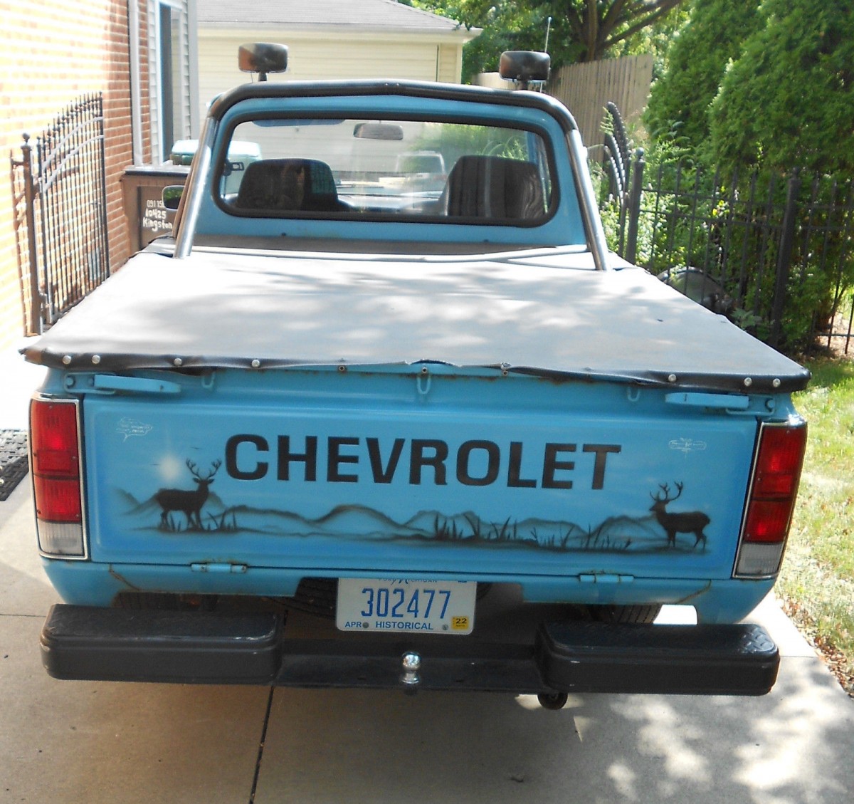 This Chevy LUV is obviously loved by its owner. Its had an elaborate custom airbrush graphics job applied and it has been highly accessorized. Whitetail deer, elk, and moose adorn the hood, side panels and tailgate along with go-faster stripes down the sides. Period slotted wheels, bed cover and a light bar round out the appearance. We don’t have any close-up photos of the lower edges or rocker panels but it looks like there is some rust-through there.