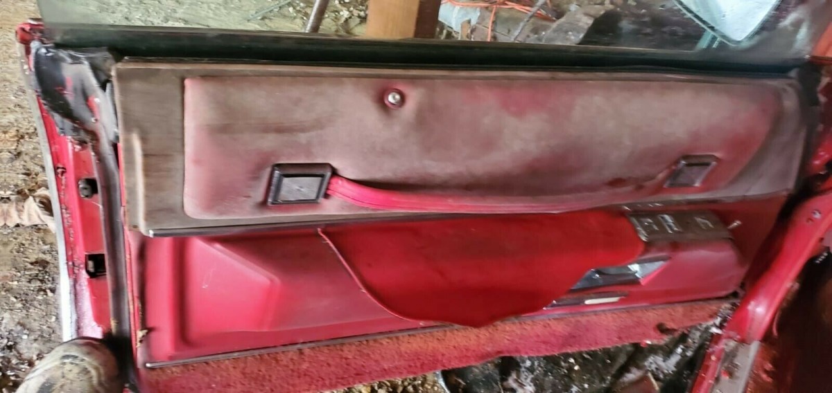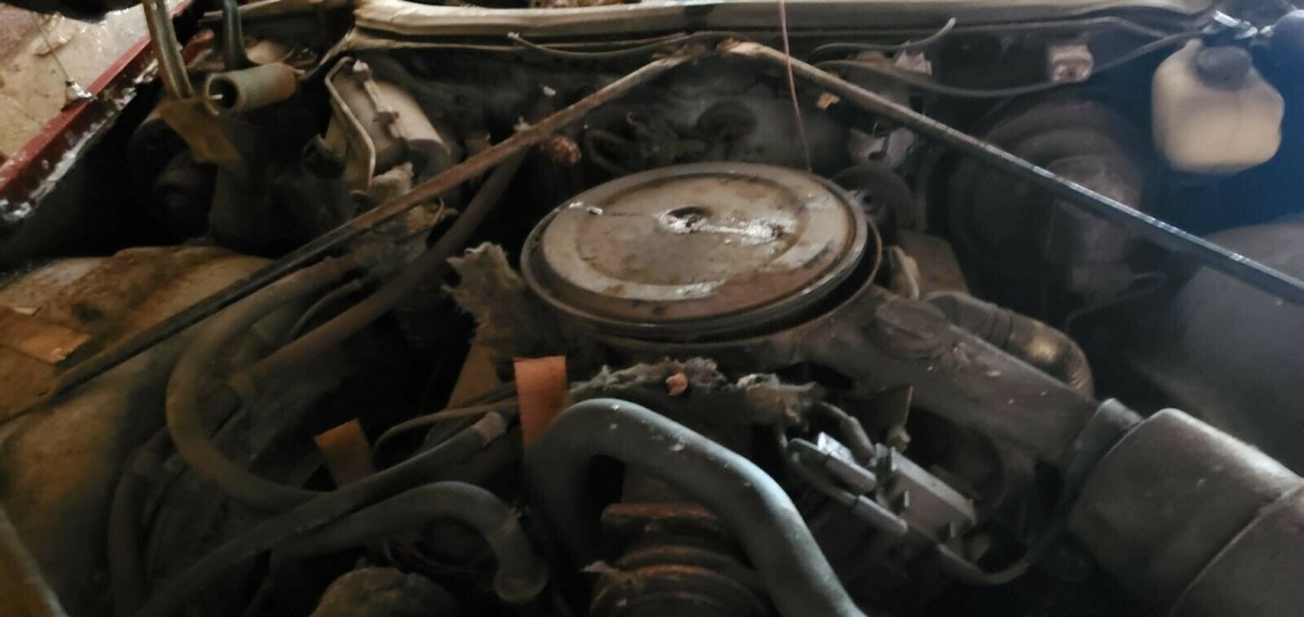 The interior at best is very dirty and stained and the matching red upholstery looks really faded. The driver’s door panel is going to need some work and the steering wheel is a mess. These cars were heavily dependent on power accessories to do all the work, so if any of this has gone bad over the years, you might have some expensive wiring issues to fix. But that’s just speculation.