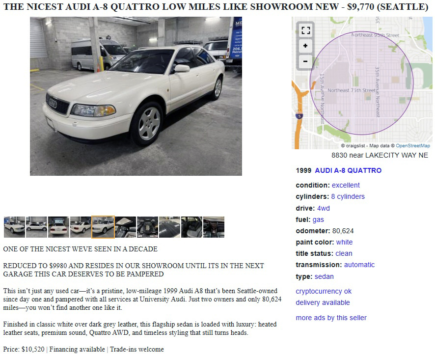 While over 2.5 decades old now, this 1999 Audi A8 4WD luxury sedan is a nice compromise for folks who are overwhelmingly tired of the level of electronics and other media screens, WiFi nannies, and other often-glitchy stuff in modern vehicles. It can be found posted here on craigslist in Seattle, Washington, and the seller is asking $9,770. Here is the original listing, and thanks to Curvette for the tip!