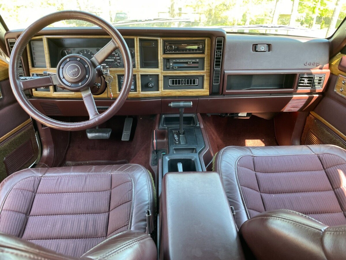 The equipment levels inside a 1988 Wagoneer Limited aren’t overwhelming by modern standards, but this vehicle would have catered to the top end of the market when it rolled off the lot. The buyer receives ice-cold air conditioning, power windows, power locks, six-way power front seats, cruise control, a leather-wrapped tilt wheel, and seats covered in leather and cloth. The only visible upgrade is to the in-car entertainment, with the original radio/cassette player making way for a Pioneer radio/CD player with Bluetooth. The overall condition of the interior is impressive, with no significant wear, no broken trim, and no stains on the seats or carpet. The woodgrain on the dash and doors accentuates the luxurious feel, and this is as spotless as the rest of the interior.