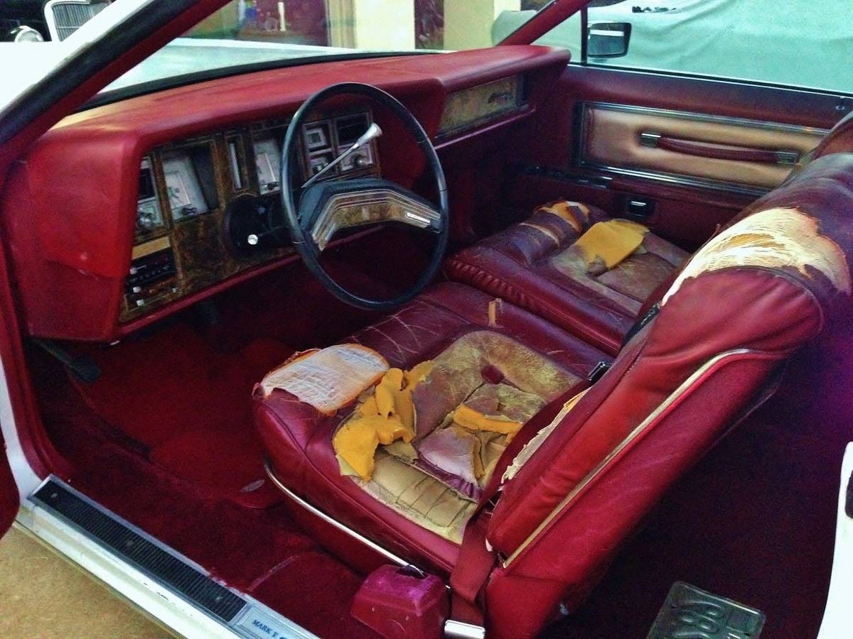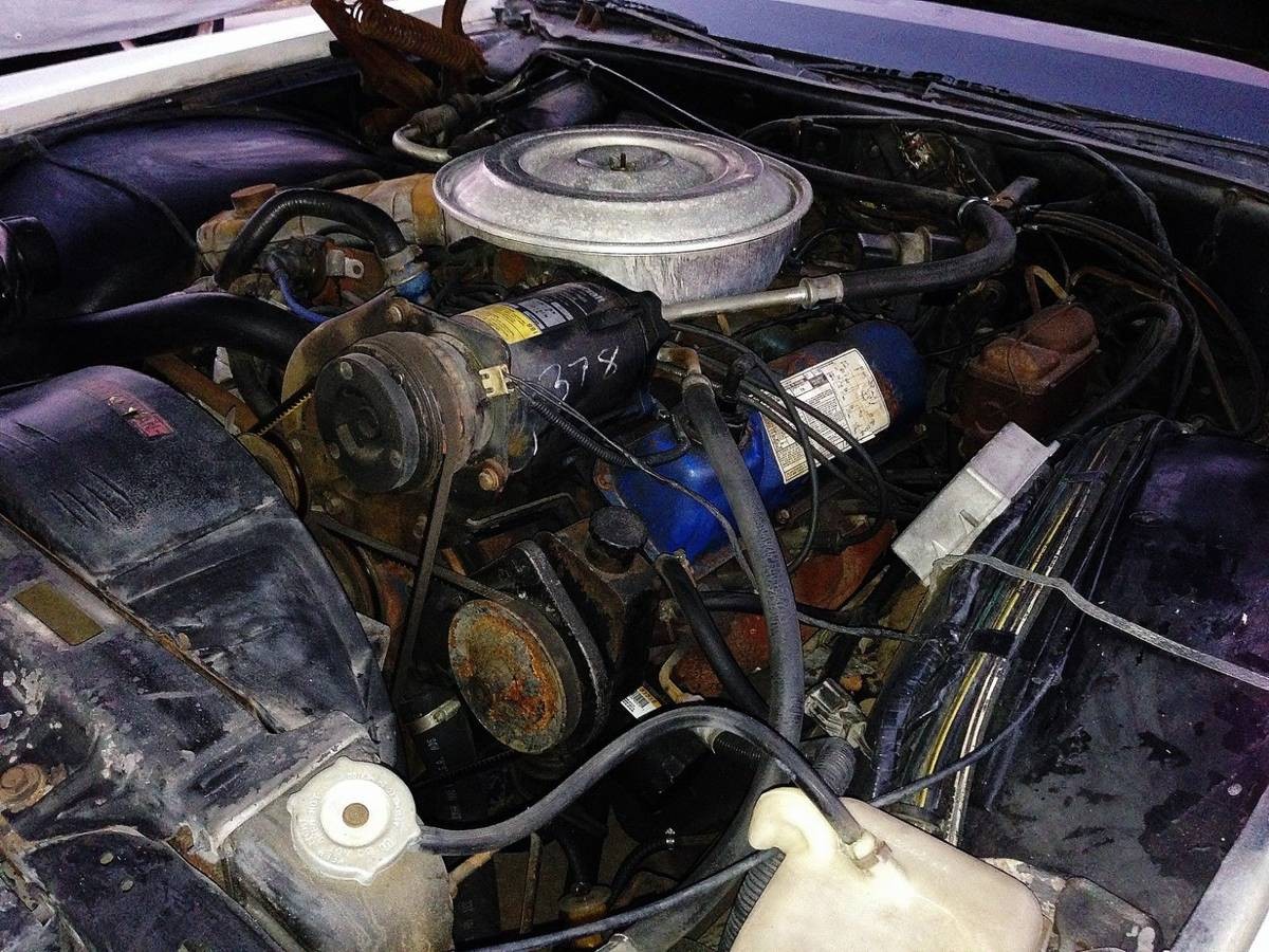 The interior is pretty much trash too, or at least the front leather seats are. The carpeting may be OK, but hard to tell from the pictures. The dash has a crack in the center. The steering wheel is also cracked. It’s a little unusual to see a black steering wheel and column in this car because I believe Ford color keyed the steering wheel/column to the interiors in the late seventies. The seller says the power seats, windows, and door locks are working. The ventilation system is functioning and the compressor comes on, but to me, that means the air is not cold. Otherwise, in all the information given in this ad, that would be included.