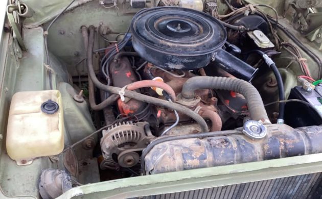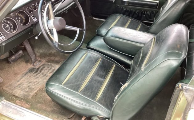 We assume the original color was Light Green Poly along with a dark green vinyl top and matching interior. All of this is from the factory and is showing its age. The lower quarter panels have some rust, and there is one large dent, so you may want to replace both. The seller says the paint still shines, but we’re not sure that will be satisfactory. The photos of the passenger compartment reflect better conditions.