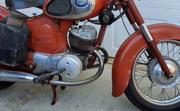 The engine is a Puch 175-cc two-stroke twin/single, known as a Twingle, a split-single with two pistons in a single bore and 10 horsepower. It’s backed by a four-speed transmission, and this engine is an interesting setup and always gets a few comments, so let’s hear your thoughts on this engine and this 175, in general. This one runs and drives and comes with the saddle bags shown in a couple of the photos, and the owner’s manual. Any thoughts on this Allstate DeLuxe?