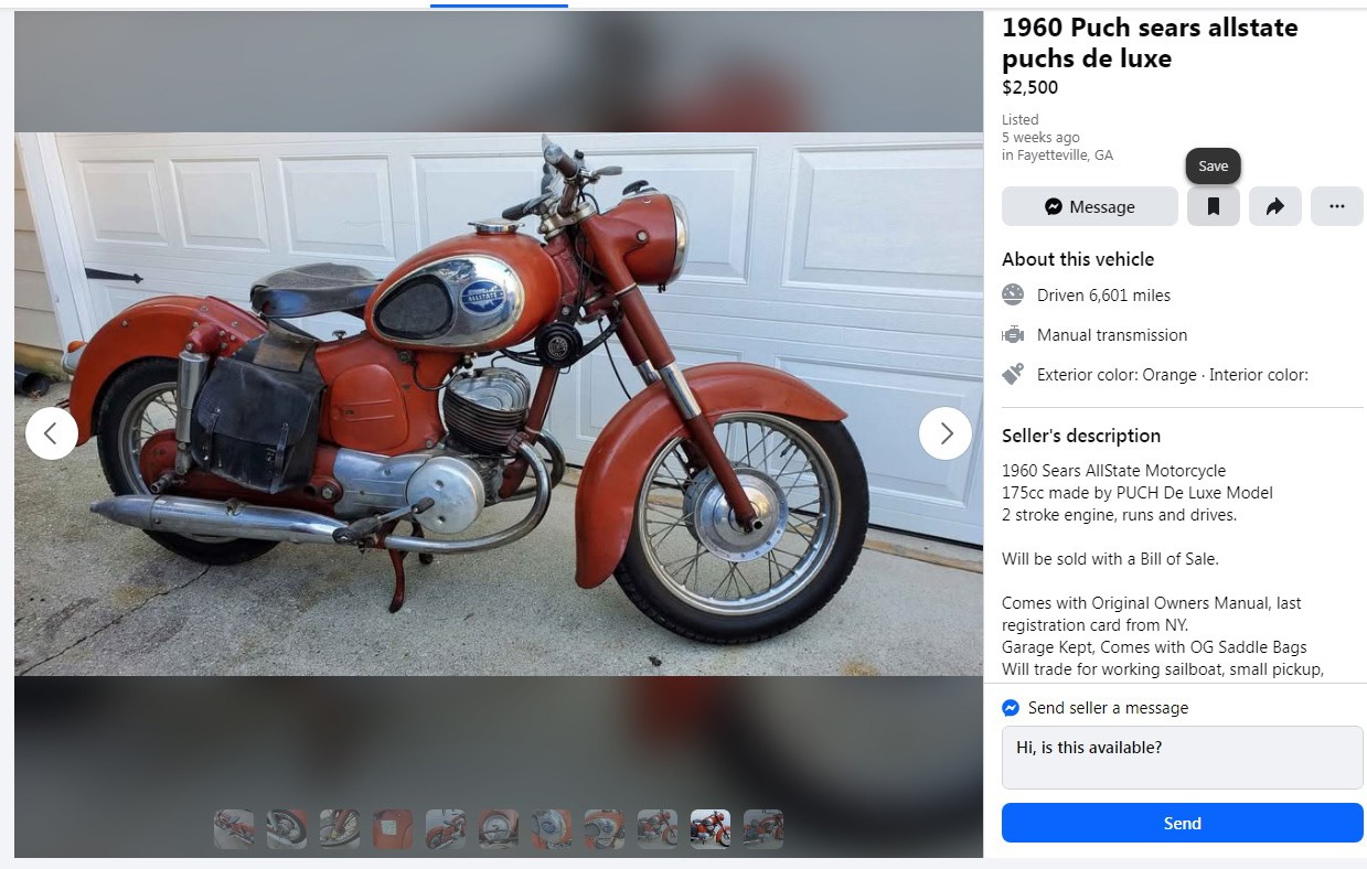 Before malls (“What’s a mall, daddy?”) and even online shopping, millions of us browsed through big, fat catalogs and bought items from underwear to houses and everything in between, including motorcycles. This 1960 Allstate DeLuxe 175 is one that would have been in a Sears catalog, and it’s listed here on Facebook Marketplace in Fayetteville, Georgia, and the seller is asking $2,500. Here is the original listing, and thanks to PRA4SNW for the tip!