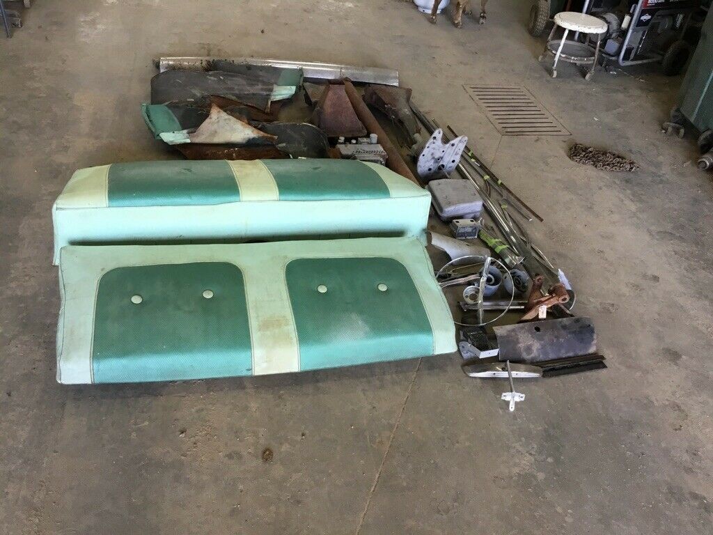 There are no photos of the interior, but we do get this photo which shows a pile of parts, including the rear seat and a few other trim items. That seat looks to be in pretty reasonable condition, and the car must have been incredibly attractive finished in its original Surf Green with this interior trim. It does look like the power top was black, but I think that a white top would look really trick if the exterior was being restored to original.