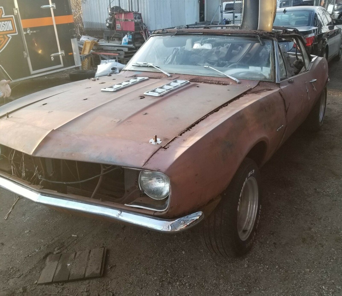This pile looks like he found it out of a field somewhere where its sat for 30 years , slapped a set of wheels on it and towed it home. He could at least have pulled the bush that had grown up between the bumpers . The rear spoiler looks like it was recently removed , maybe the guy bought the car for that and whatever drivetrain parts that were still in the car and now is trying to sell the rest. With all the reproduction parts available for Camaros I don’t even think its worth it for parts.
