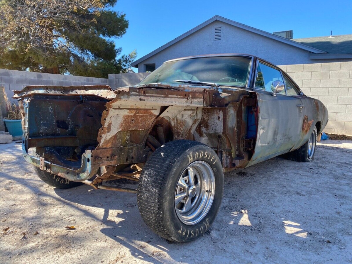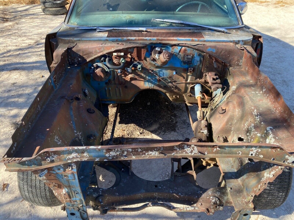 This Charger left the factory with B5 blue paint and a black interior. It had a common list of appointments which included a 2-barrel 383 cubic inch V8, TorqueFlite automatic transmission, factory air conditioning, and power steering. But all of that is gone now, including most everything important from the cowl forward.