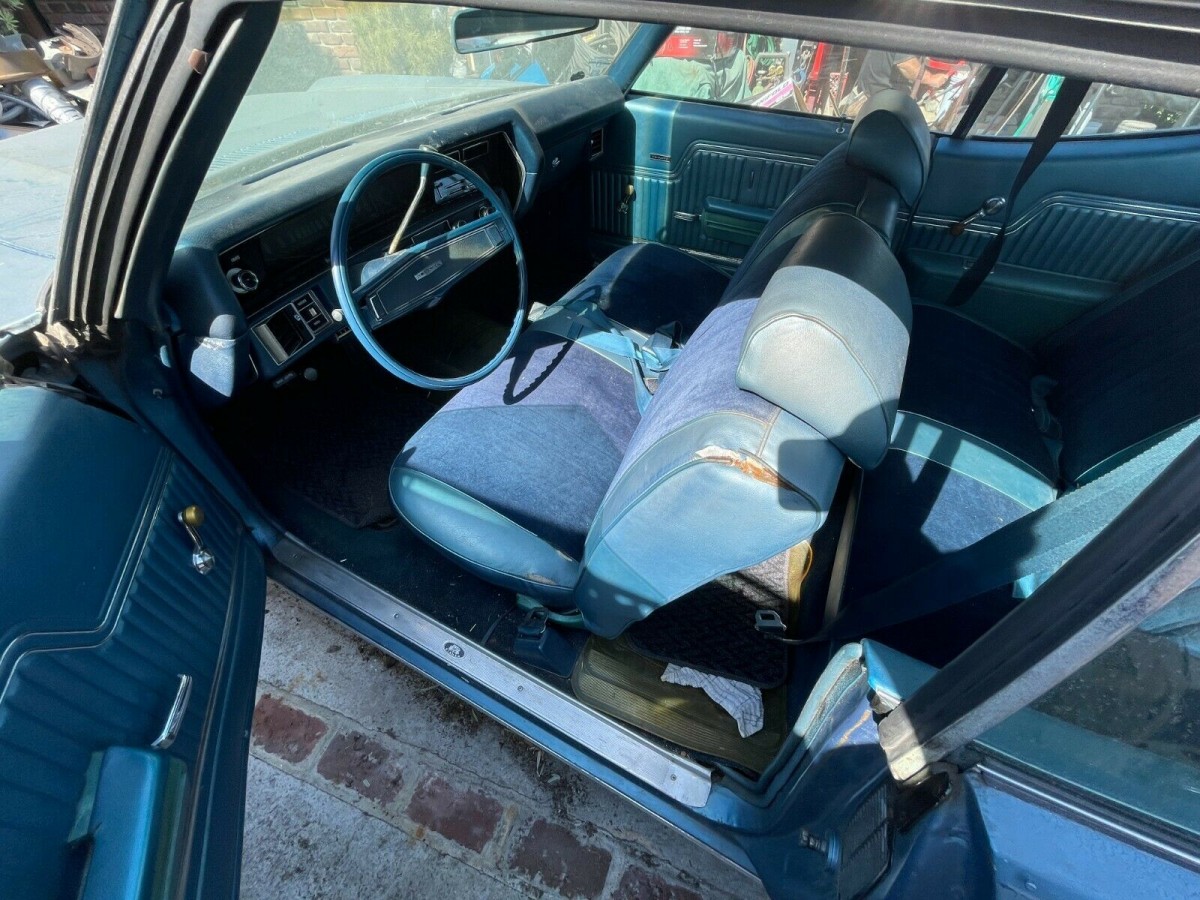 The photos provided show a car trapped in its surroundings, so it’s hard to view the car as a whole. The white vinyl top may be okay if cleaned up, but the light blue paint is showing its age and there is some red primer in places where some dents or rust have been attended to. Don’t be surprised if there’s more lurking. On the other hand, except for one tear in the driver’s seatback, the interior may be just fine.