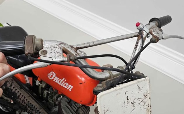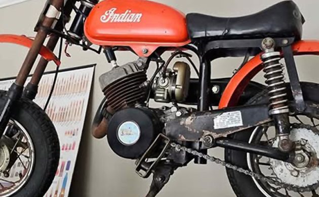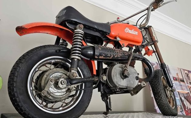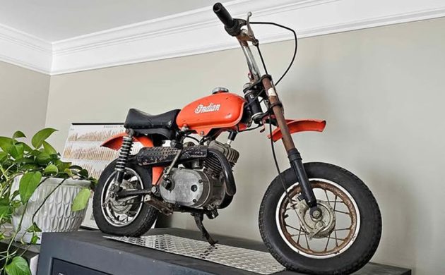 As a rebadged Italjet, this one is powered by a 48-cc two-stroke with a whopping 1.3 horsepower. It sends power to a single-speed automatic transmission with a centrifugal clutch, so no shifting, and Indian detuned them to have a maximum speed of 10 mph to be “safe” for young riders. This one was “running when parked”, but it’s been 15 years, so it’ll take some fiddling to have it fogging for mosquitoes (i.e., two-stroke blue smoke) again. Let’s hear those mini motorcycle stories!