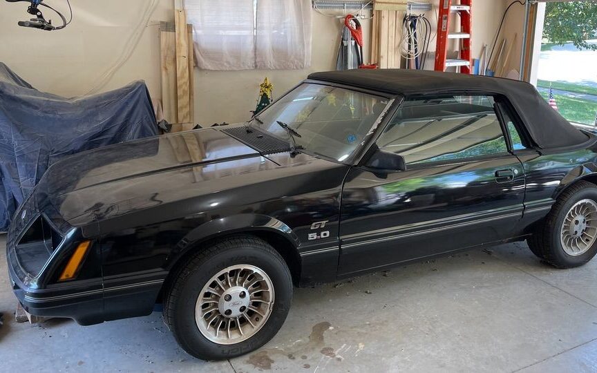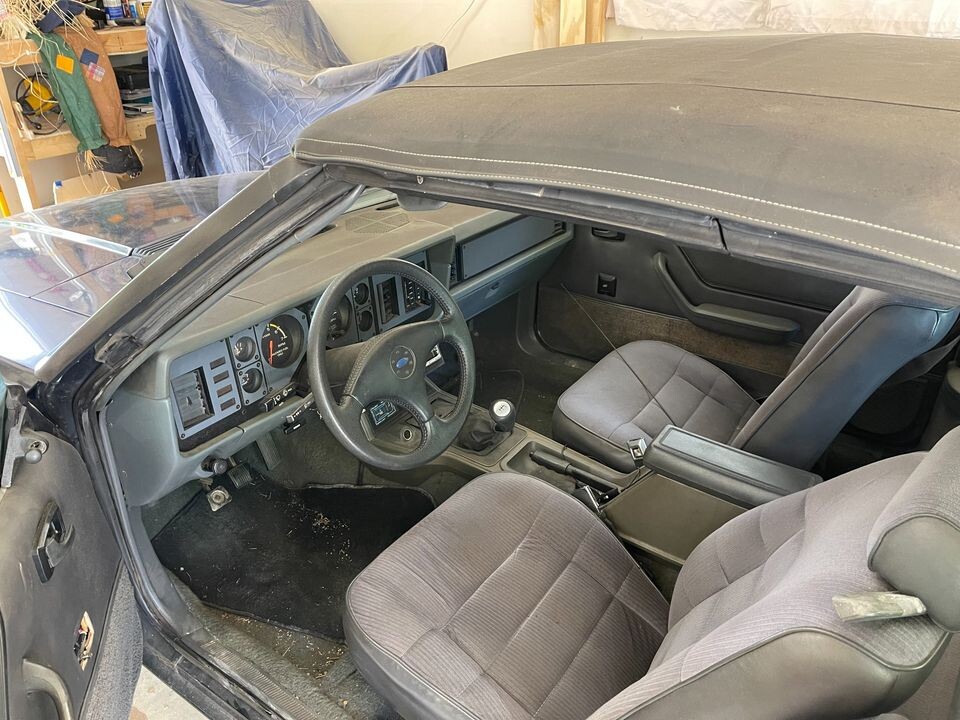 Too many mismatched parts to be a real 83 GT. No flat black center hood with the added blister, no GT decals above the 5.0 fender badges or trunk lip, 85 or 86 instrument cluster. Odd in 83 only the door windows were power, rears you had to roll up. This is probably a cobbled up GLX. My mom’s last car, when she retired, was a white 85 GT convertible, black top with the grey waffle (?) cloth seats with the red piping, the seat front extender, and the square halo headrests. GT was embossed into the rub strip just behind the doors, had a decal on the right trunk lip corner, and was cut out to the body color in the center flat black on the hood. Had the Marchal fog/driving lights below the bumper (just try to find those!)with the 85 optional fuel injection and 4 speed overdrive automatic